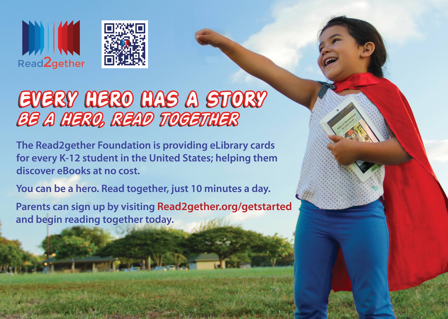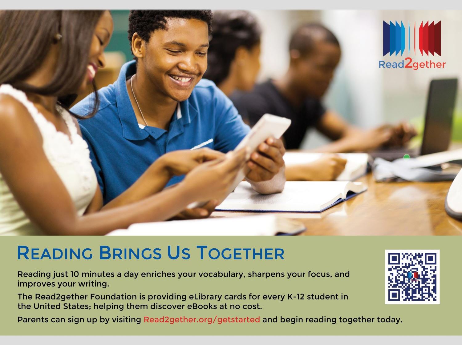 Read2gether is a national campaign to raise awareness about Recreational Reading for 10 minutes a day, and the importance of reading on human development, especially in the Kindergarten through 12th Grade years by providing every K-12 student in the United States eLibrary cards, at no cost, for the next 3 years. The Read 2gether Foundation is dedicated to assisting children and young adults a way to discover books using technology and access to over 3 million ebooks and documents. The main goal of this Read 2gether Foundation campaign is to bring back the joy of daily Recreational Reading.